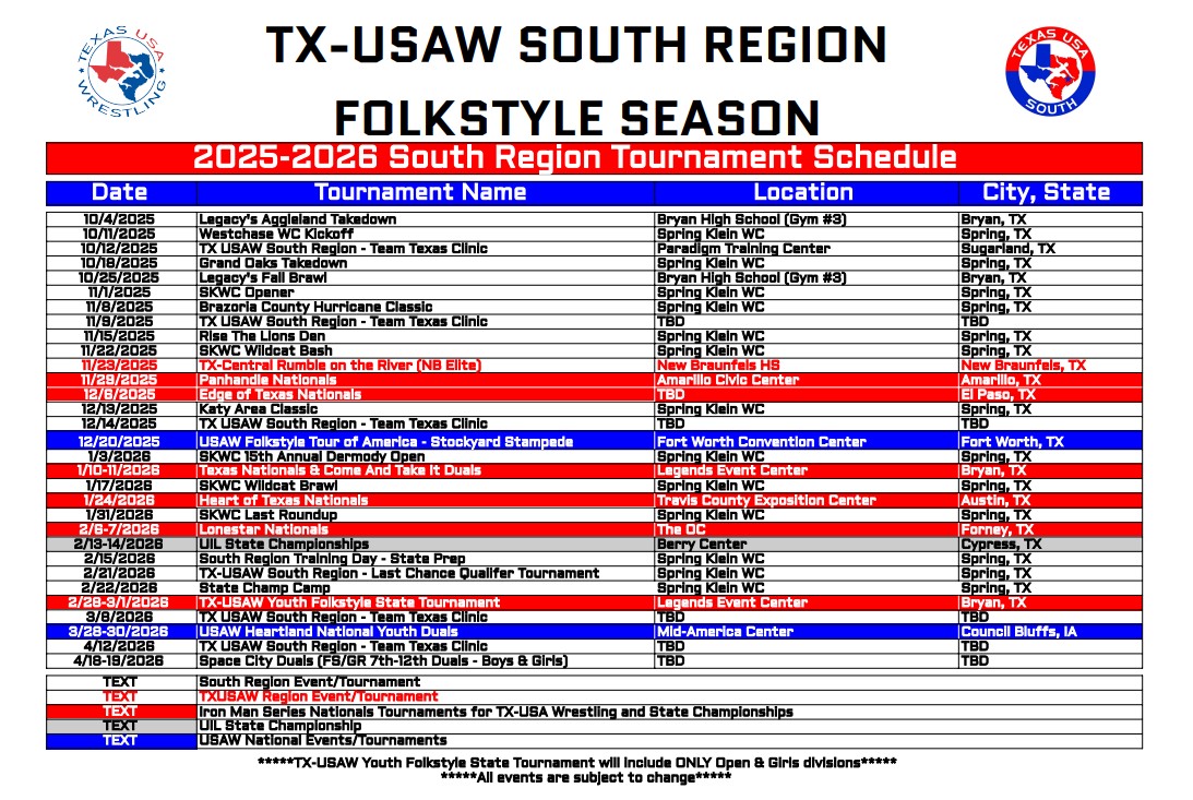 The TX-USAW SOUTH REGION FOLKSTYLE SEASON schedule is here!